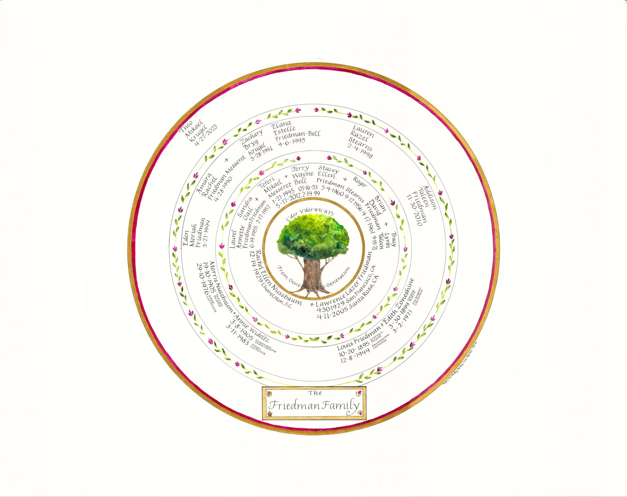 Family Trees come in so many formats. I developed these in a circular style out of necessity and then out of wonder at the form, the symmetry and this style is one where your family tree has a beautiful artistic rendering that reflects your family’s history.